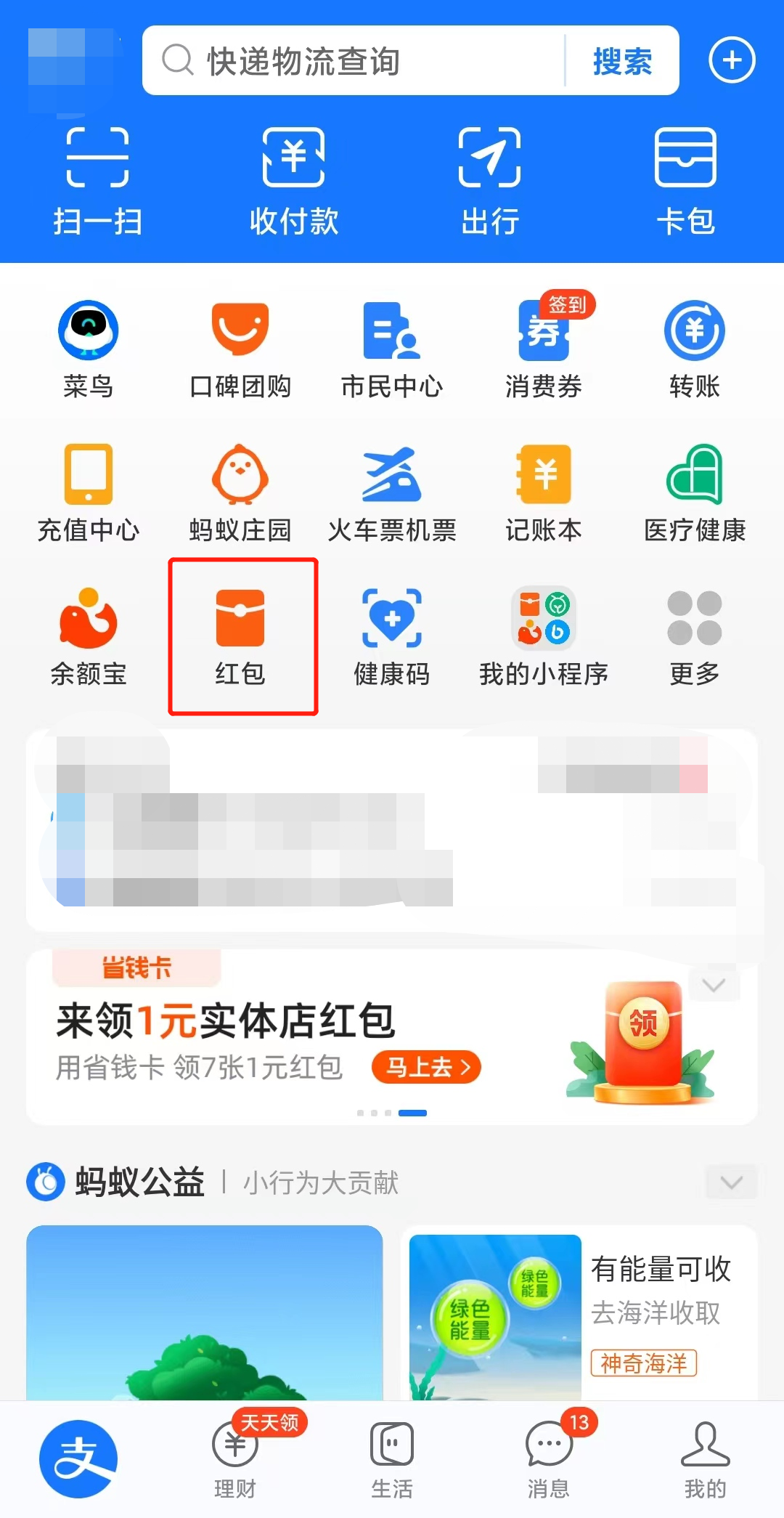 第一步,打开手机上的支付宝APP,点击页面上方“红包”。