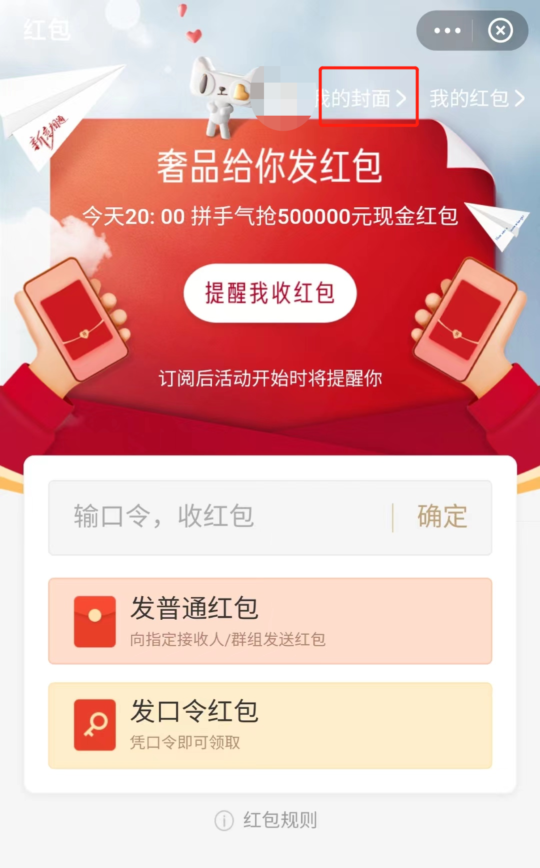 第二步,进入到红包应用首页,点击页面上方“我的封面”。