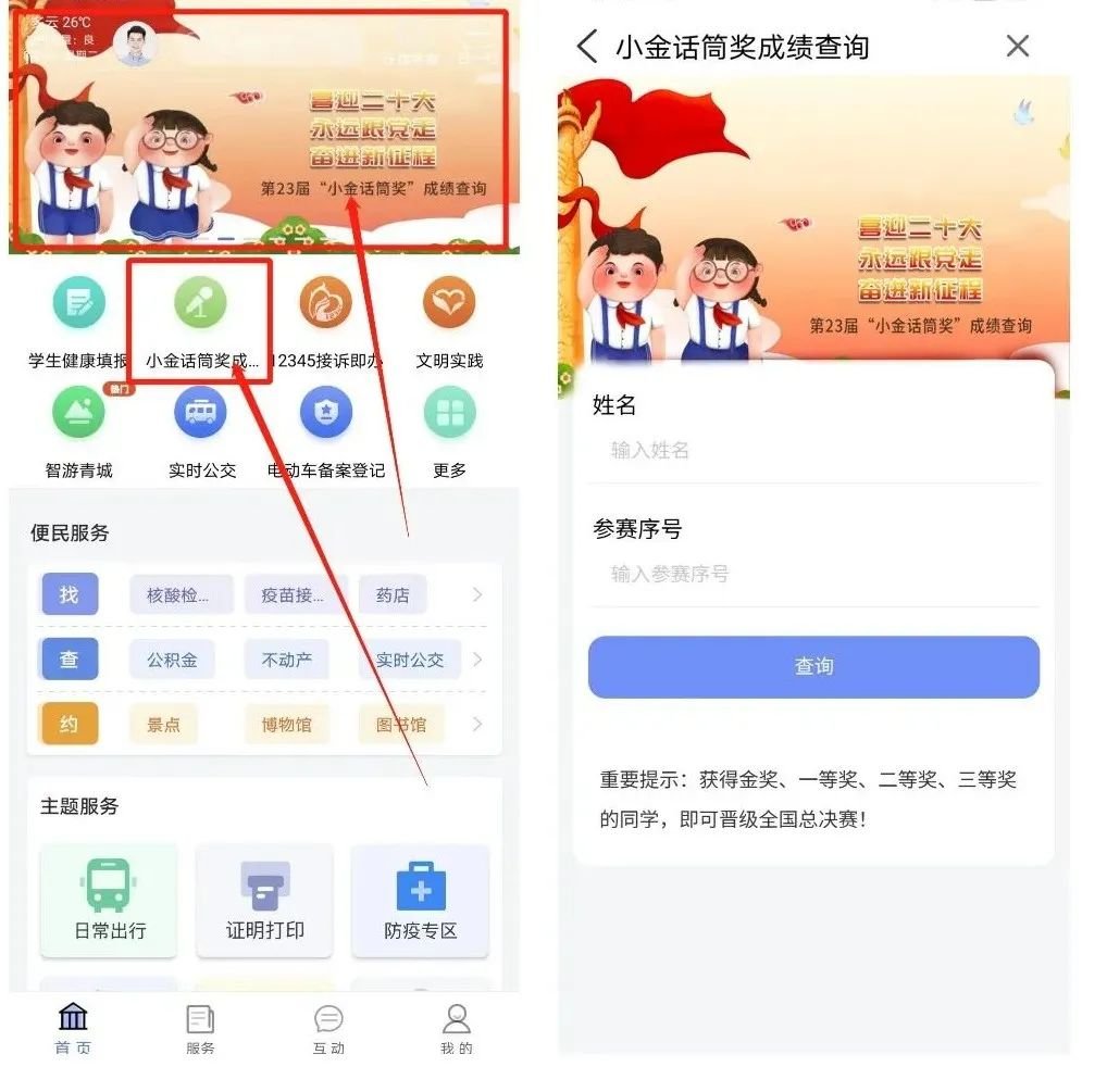 第二步:进入“爱青城”APP首页,点击【小金话筒成绩查询】轮播图或者【小金话筒成绩查询】功能,输入姓名、参赛序号即可查询。