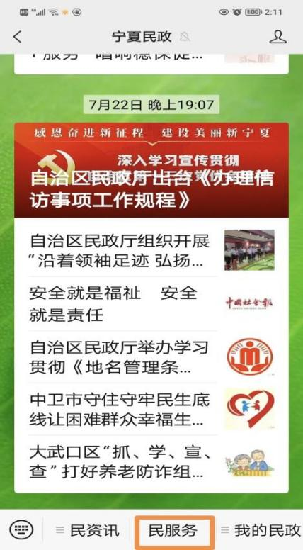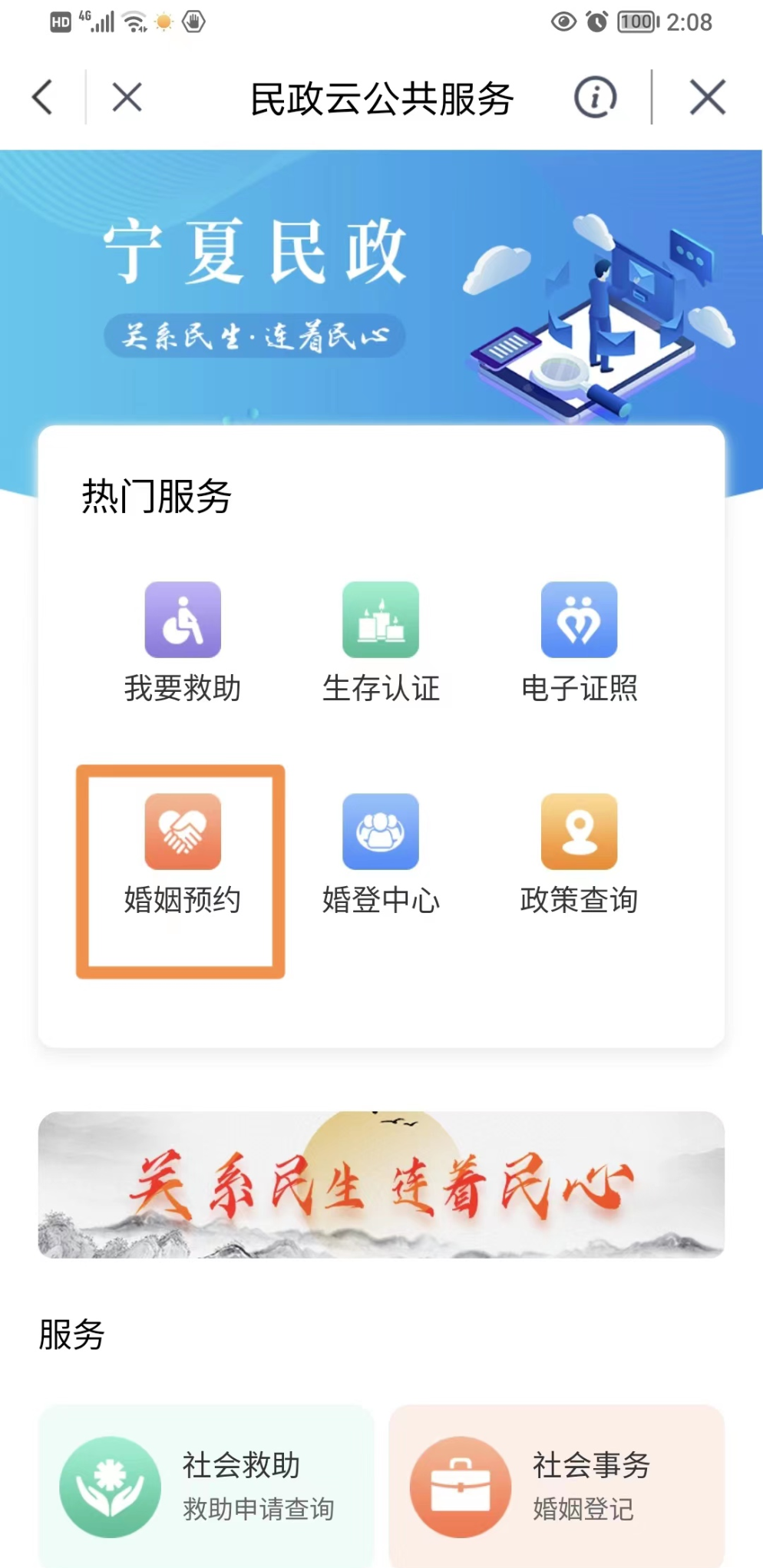 打开“我的宁夏”APP,首页主题服务专区里点“更多”,进入后找到民政服务,点击“民政云公共服务”进入,点击“婚姻预约”进入预约程序。