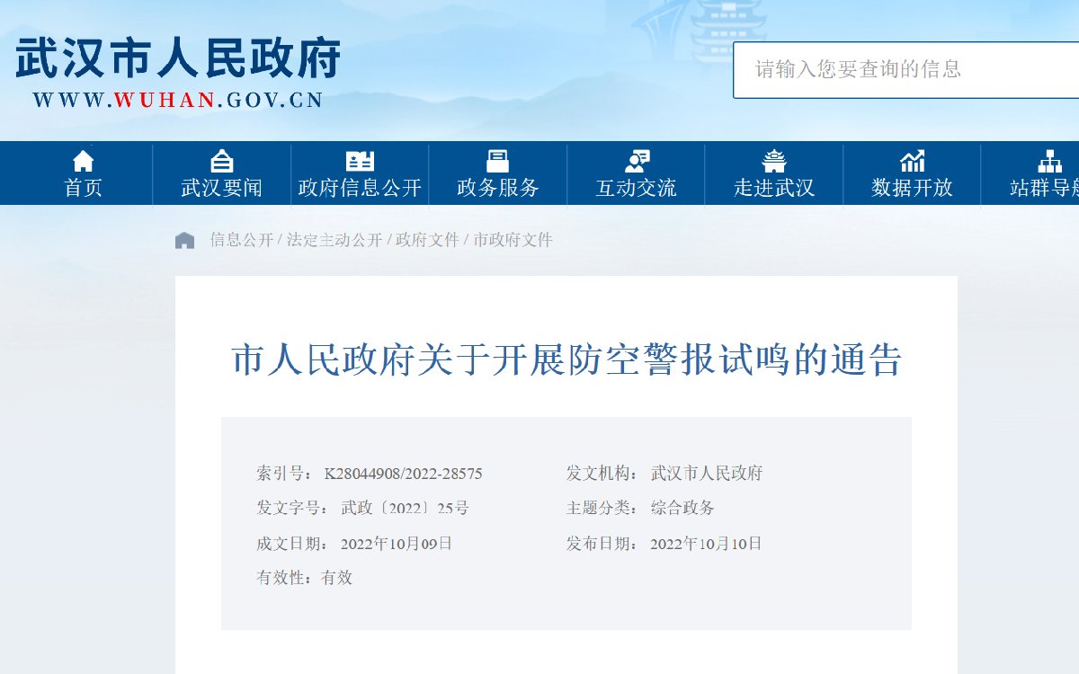根据《中华人民共和国人民防空法》《武汉市人民防空条例》规定,经研究,定于2022年10月25日16时00分至16时30分在全市进行防空警报试鸣。期间,请各级党政机关、企事业单位、社会团体和广大人民群众保持正常工作和生活秩序。防空警报鸣放具体时间及信号规定如下: