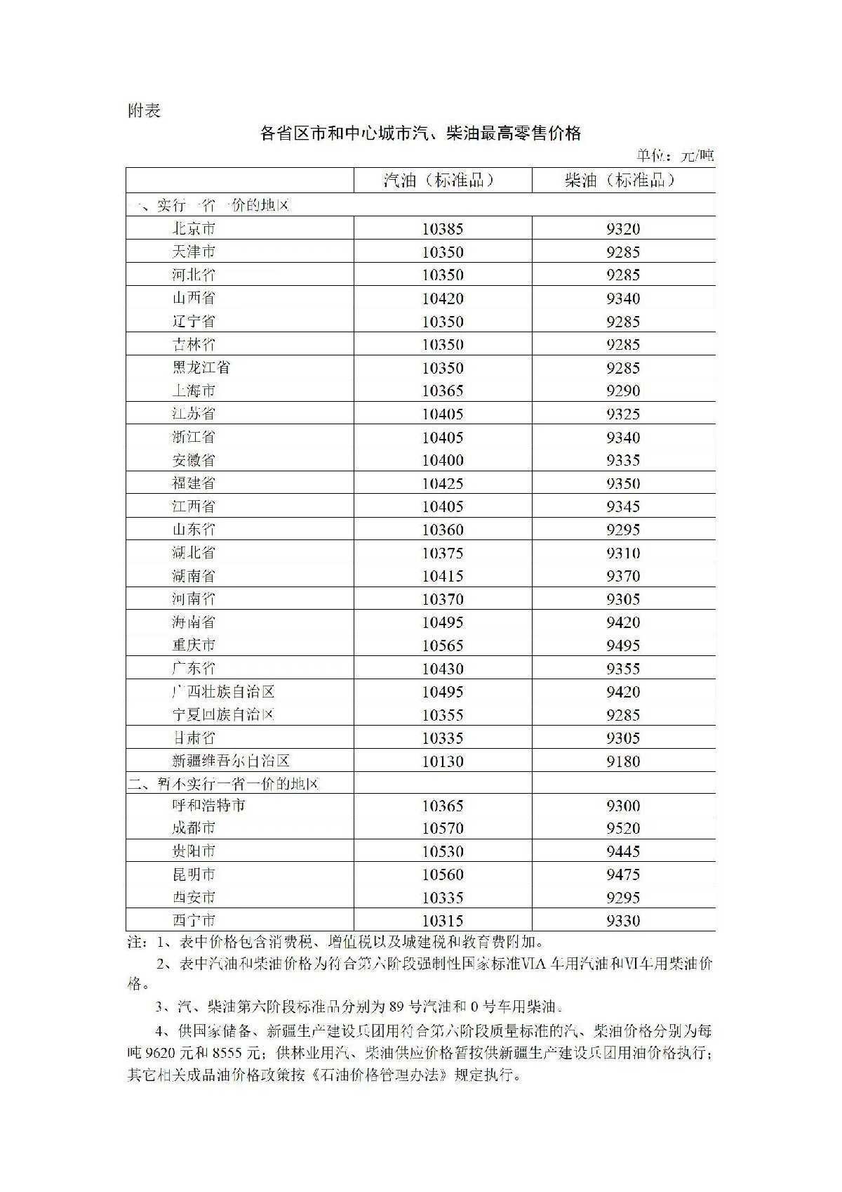 根据近期国际市场油价变化情况,按照现行成品油价格形成机制,自2022年10月24日24时起,国内汽、柴油价格(标准品,下同)每吨分别提高185元和175元。调整后,各省(区、市)和中心城市汽、柴油最高零售价格见附表。相关价格联动及补贴政策按现行规定执行。