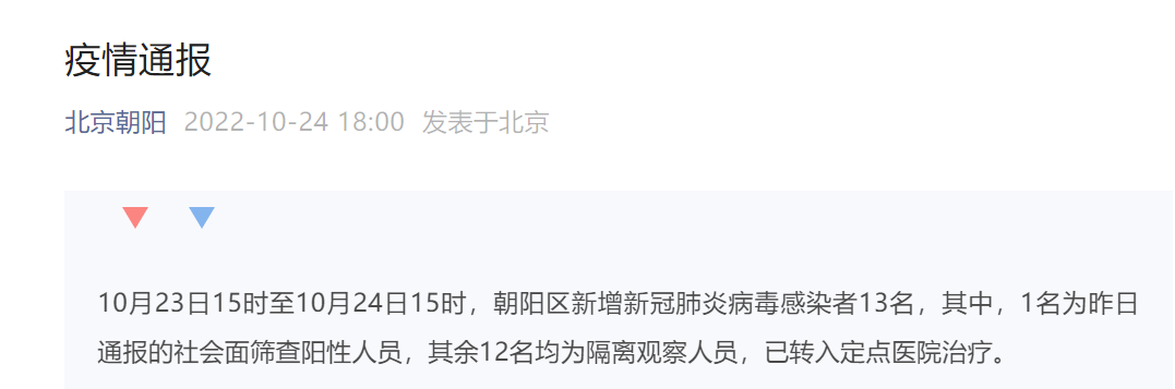 10月23日15时至10月24日15时,朝阳区新增新冠肺炎病毒感染者13名,其中,1名为昨日通报的社会面筛查阳性人员,其余12名均为隔离观察人员,已转入定点医院治疗。