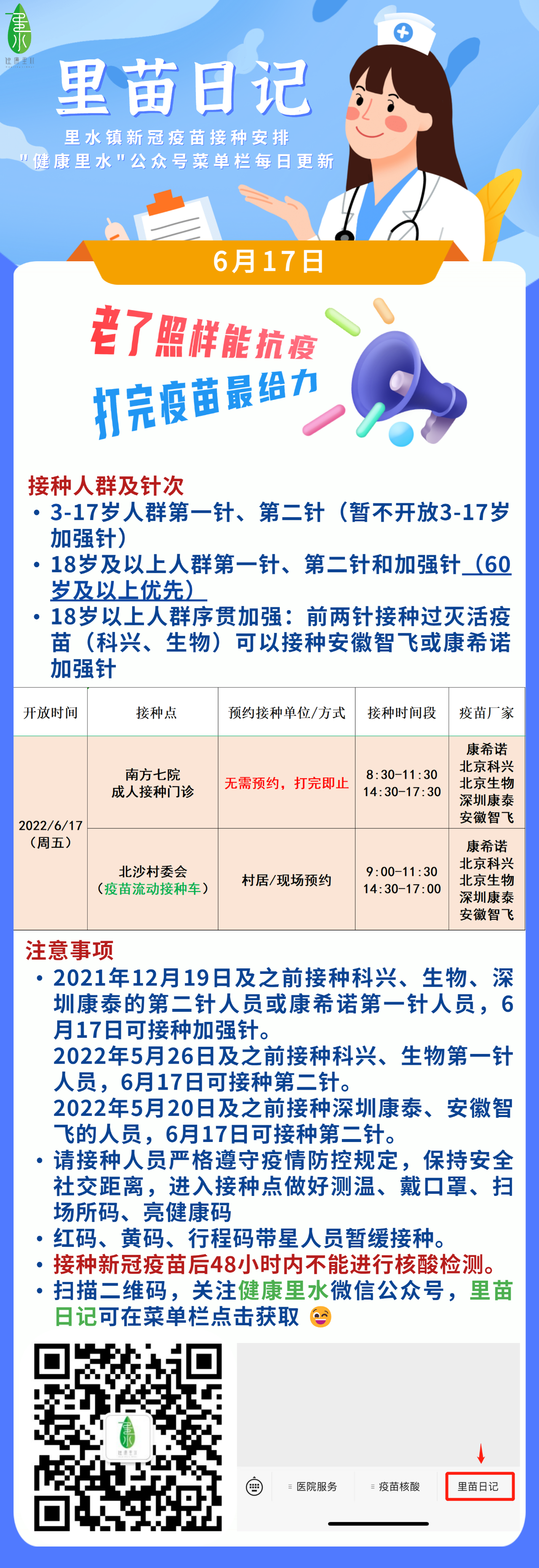 ▶2022年6月17日,里水镇新冠疫苗接种安排: