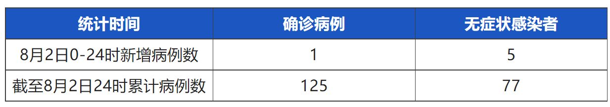 8月2日0-24时,“07·20”疫情新增本土确诊病例1例,新增本土无症状感染者5例。截至8月2日24时,本起疫情累计报告本土确诊病例125例,本土无症状感染者77例。