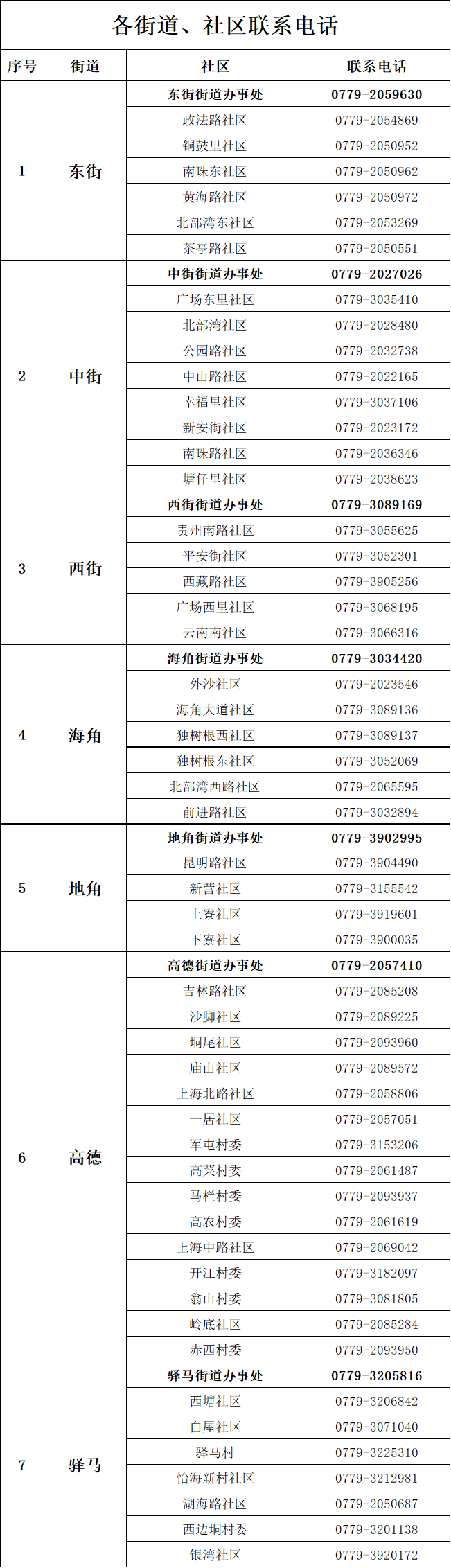 各街道、社区联系电话