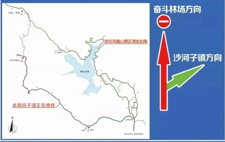 请来凤凰山景区的游客朋友们绕路行驶,须提前在雪乡公路50公里处沙河子镇右转绕行,途经磨盘山村、大柜村、三人班、福太屯、亮甸子、凤凰山经营所,全程66公里。详情请看图解。