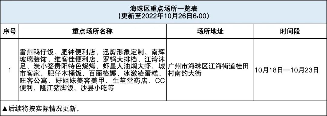 据广州海珠发布消息,根据疫情防控需要,请在10月18日至10月23日到过海珠区江海街道桂田村南约大街的人员,立即向所在社区(村)联系报备,并配合做好疫情防控措施。若不如实申报、不落实防控措施造成严重后果的,将承担相应法律责任。
