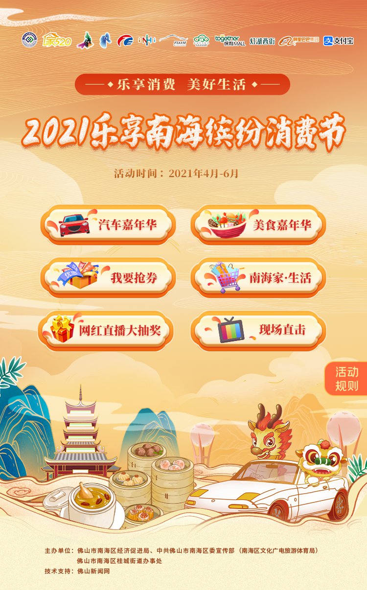 4月30日起2021乐享南海缤纷消费节启动啦,汽车美食攻略、抢消费券(满100-20、满80-10)、网红直播等。