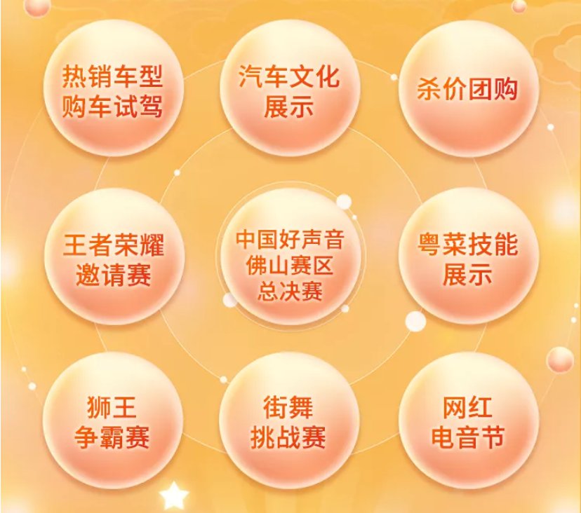 ⭐温馨提示:活动期间,主舞台还将进行粤菜技能展示、狮王争霸赛、街舞挑战赛、王者荣耀邀请赛、中国好声音佛山赛区总决赛、网红电音节等系列精彩活动,打造“五一”盛典。