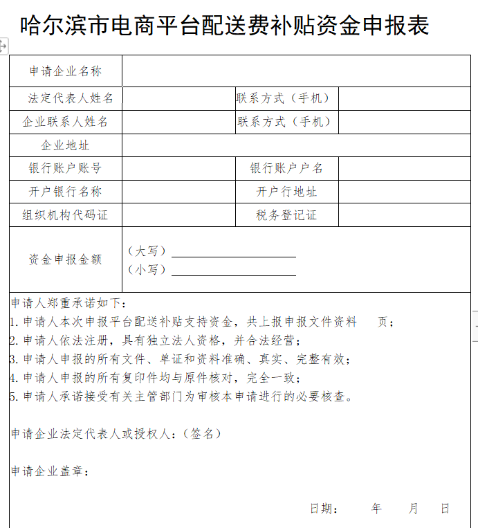 哈尔滨市电商平台配送费补贴资金申报表下载