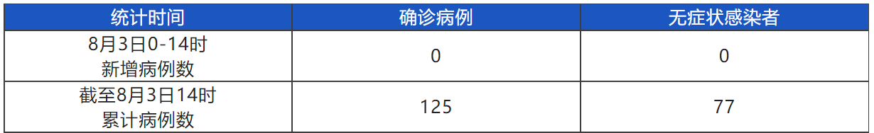 8月3日0-14时,成都“07·20”疫情无新增本土确诊病例,无新增本土无症状感染者。截至8月3日14时,本起疫情累计报告本土确诊病例125例,本土无症状感染者77例。