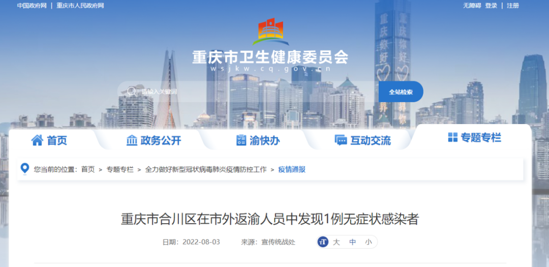 8月3日,合川区报告1例本土无症状感染者。据初步调查显示,该员7月31日从市外返渝抵达合川区,当日核酸检测为阴性。8月3日,根据实验室检查结果、影像学特征和临床症状,经专家组会诊,判定为无症状感染者,正在接受医学观察。