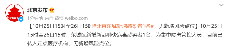 10月25日15时至26日15时,东城区新增新冠肺炎病毒感染者1名,为集中隔离管控人员,目前已转入定点医疗机构,无新增风险点位。