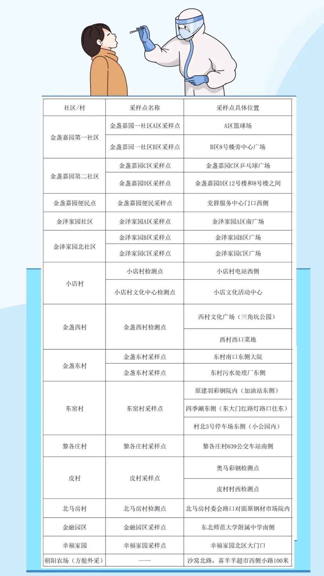 金盏地区核酸检测点位一览: