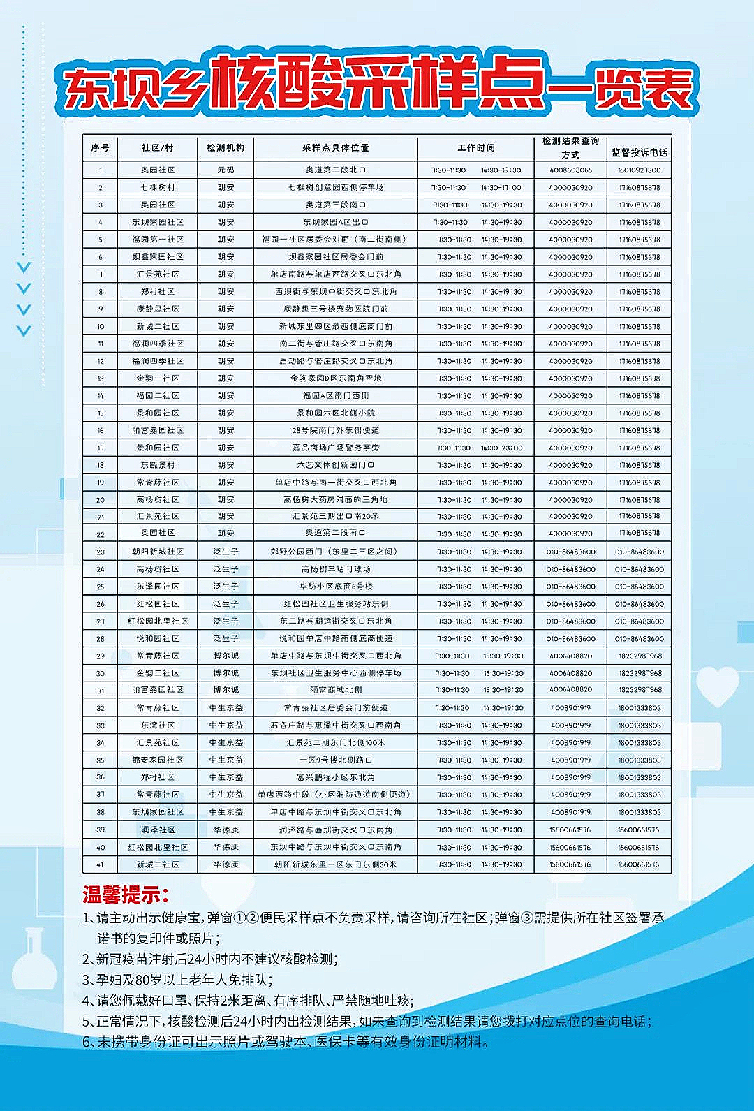 请大家积极参与并支持疫情防控工作,共建美好祥和幸福家园。请您携带好身份证、手机前往临近点位进行核酸检测检测时,请全程佩戴好口罩保持2米间距,有序排队感谢大家的配合!