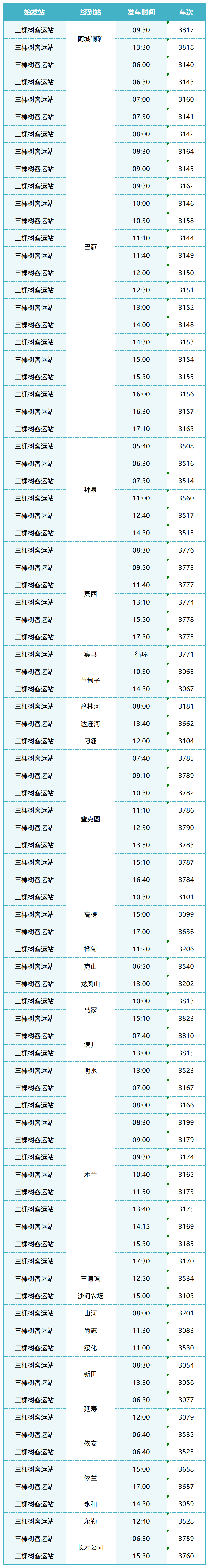 三棵树客运站班车时刻表:(更新时间:2022年8月1日)
