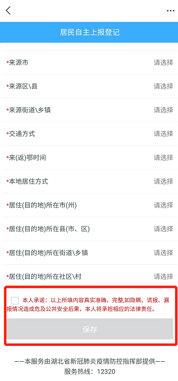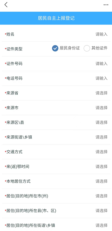 4、按照系统提示,输入姓名、证件号码、电话号码、来源省/市/区县/街道、交通方式、来返鄂时间、本地居住方式、居住地所在市等信息;