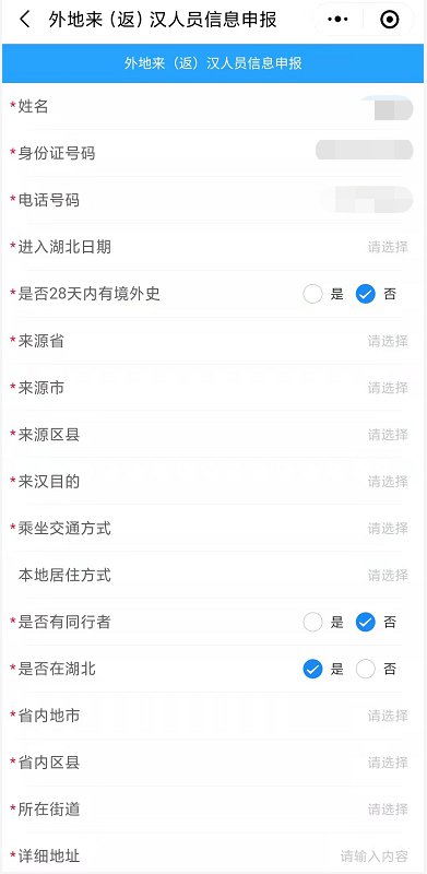 第四步:按照提示填写姓名、身份证号码、电话号码、进入湖北日期、来源地、来汉目的、乘坐交通方式、目的地地址等信息;