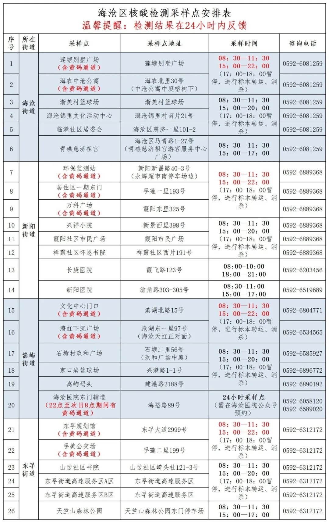 8月4日,海沧区安排26个便民核酸检测采样点,4个街道均设有黄码人员专用检测通道。海沧医院设有24小时核酸检测采样点。