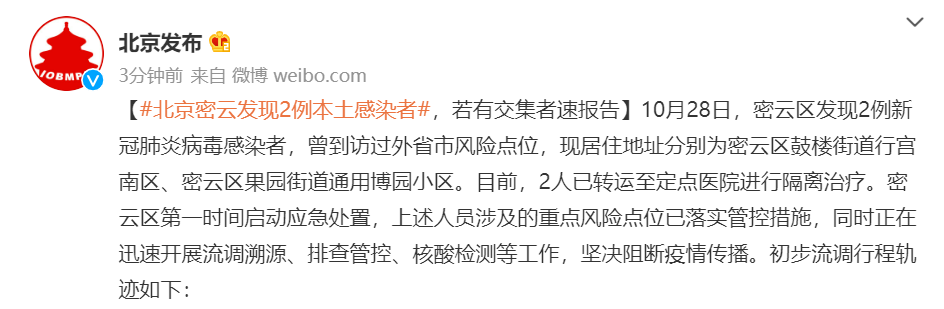 10月28日,密云区发现2例新冠肺炎病毒感染者,曾到访过外省市风险点位,现居住地址分别为密云区鼓楼街道行宫南区、密云区果园街道通用博园小区。目前,2人已转运至定点医院进行隔离治疗。密云区第一时间启动应急处置,上述人员涉及的重点风险点位已落实管控措施,同时正在迅速开展流调溯源、排查管控、核酸检测等工作,坚决阻断疫情传播。