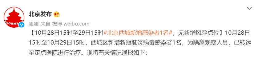 10月28日15时至10月29日15时,西城区新增新冠肺炎病毒感染者1名,为隔离观察人员,已转运至定点医院进行治疗。现将有关情况通报如下: