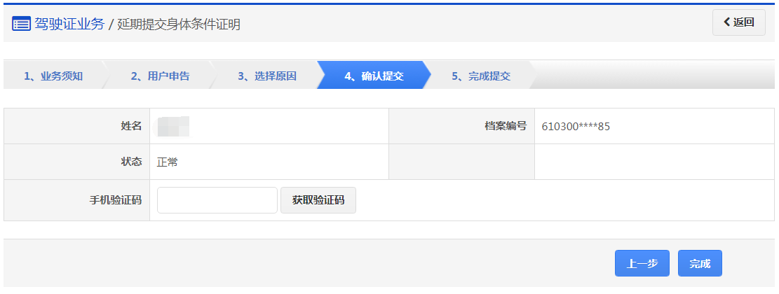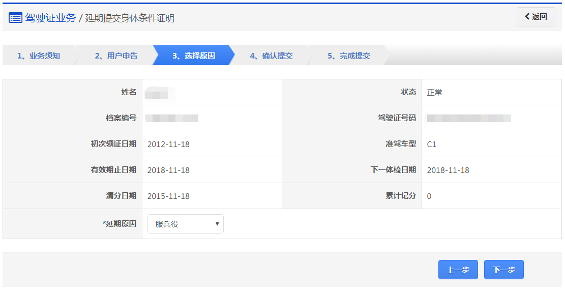 在该步骤,界面显示驾驶证的基本信息,用户认真确认各项信息无误后选择延期原因,点击【下一步】进入步骤5【确认提交】。