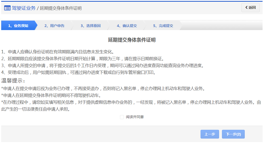 在该步骤,用户需认真阅读其内容,包括:办理延期提交身体条件证明需要注意的各项内容和相关责任,如下图所示。同意的,勾选“阅读并同意”,点击【下一步】进入步骤3【用户申告】。