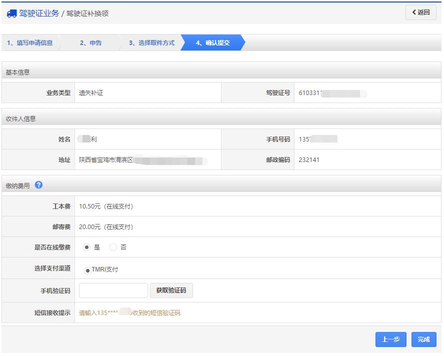 再次确认信息以后,点击【获取验证码】,系统会发送6位验证码到用户绑定的手机,用户输入手机验证码后,点击【完成】,进入步骤6【完成提交】。如果选择在线支付,提交后自动跳转至支付页面进行网上付款。