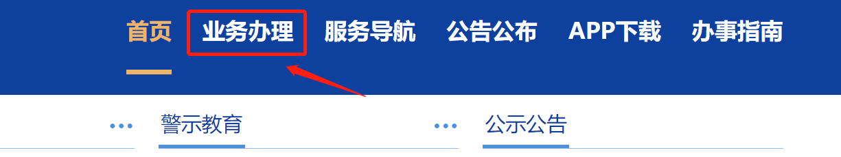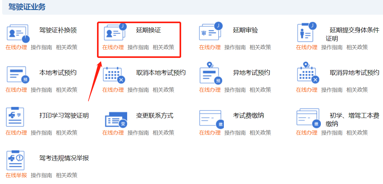 进入交管12123官方网站,在顶部菜单栏找到“业务办理”,点击并进入,在“驾驶证业务”栏中找到“延期换证”,点击并进入。