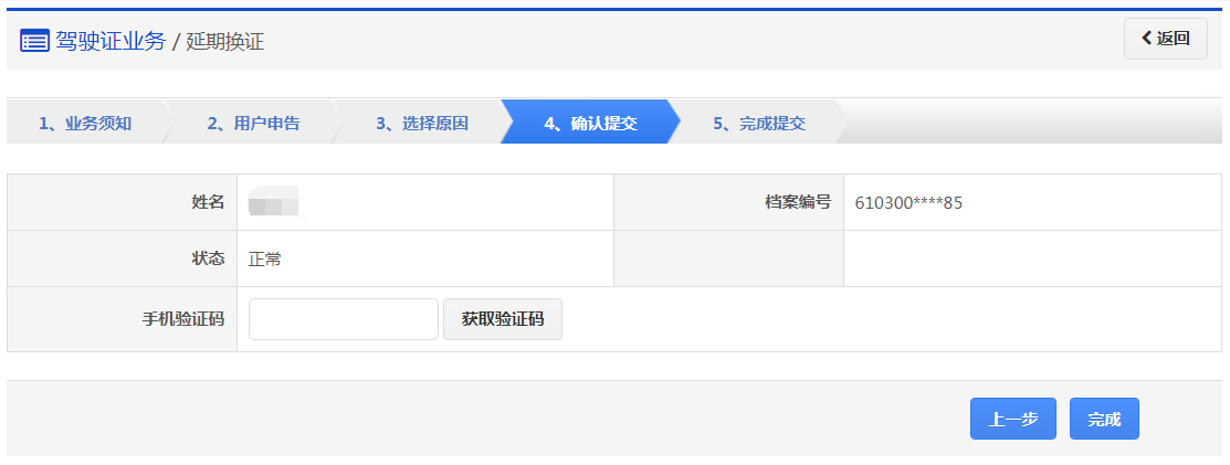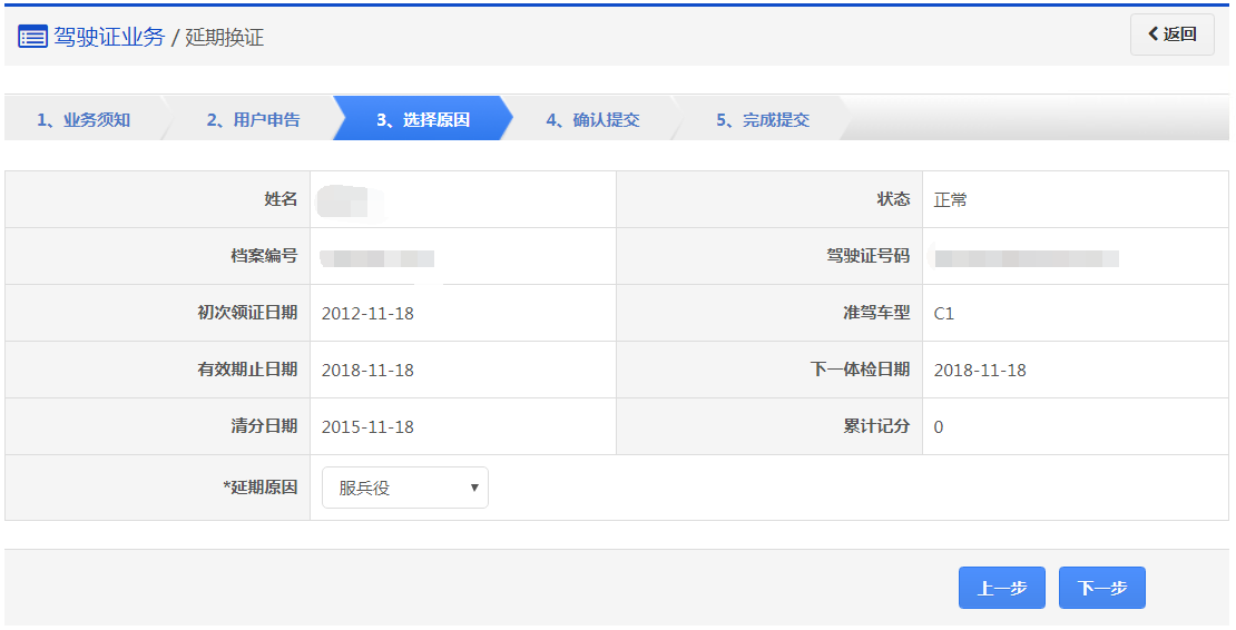在该步骤,界面显示驾驶证的基本信息,用户认真确认各项信息无误后选择延期原因,点击【下一步】进入步骤5【确认提交】。