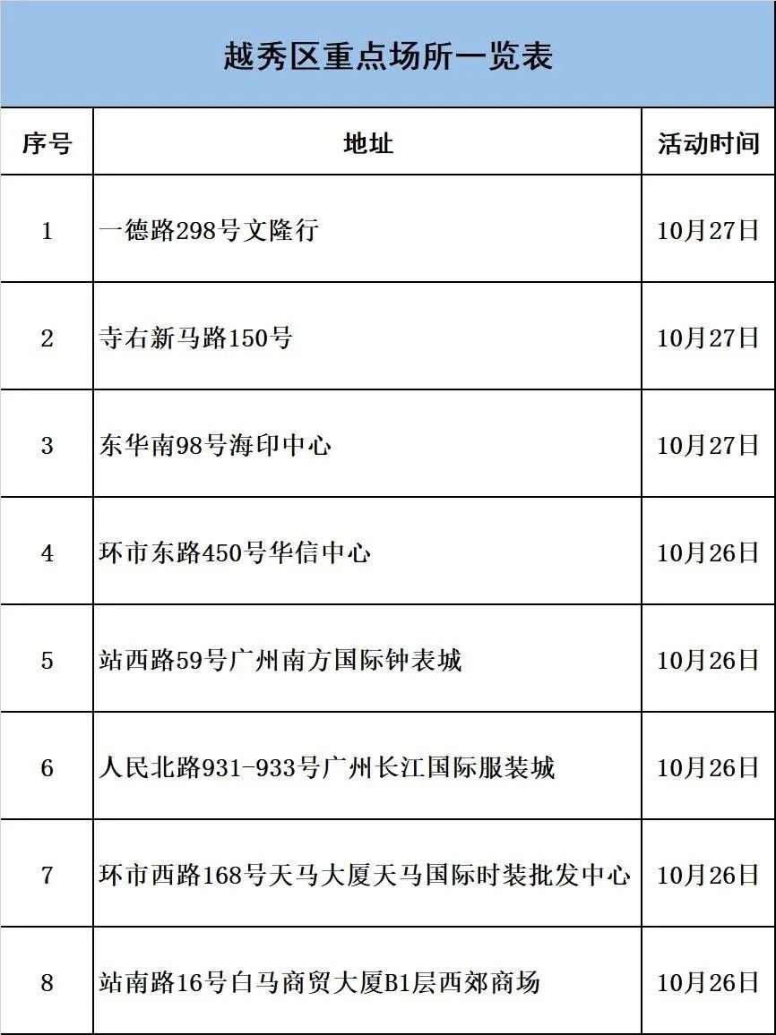 因新冠疫情防控需要,请在相关时段到过越秀区下述重点场所的人员,立即向所在社区联系报备,严格落实“3天3检”,并配合做好疫情防控各项措施。若不如实申报,不落实防控措施,造成严重后果的,将承担相应法律责任。