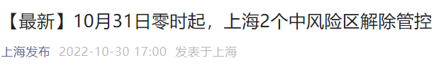 市新冠肺炎疫情防控工作领导小组办公室发布消息:根据《新型冠状病毒肺炎防控方案(第九版)》要求,经研究决定,自2022年10月31日零时起,将以下2个中风险区解除管控: