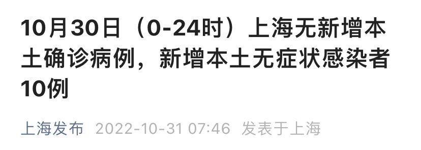 上海市卫健委10月31日通报:2022年10月30日0—24时,无新增本土新冠肺炎确诊病例,新增本土无症状感染者10例,其中9例无症状感染者在隔离管控中发现。