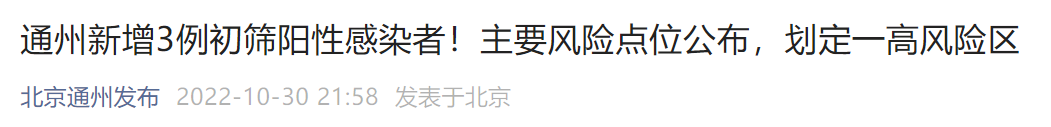 10月30日,通州区新增3例初筛阳性感染者,为同一家庭成员,现住马驹桥镇神龙辛屯小区南区7号楼。