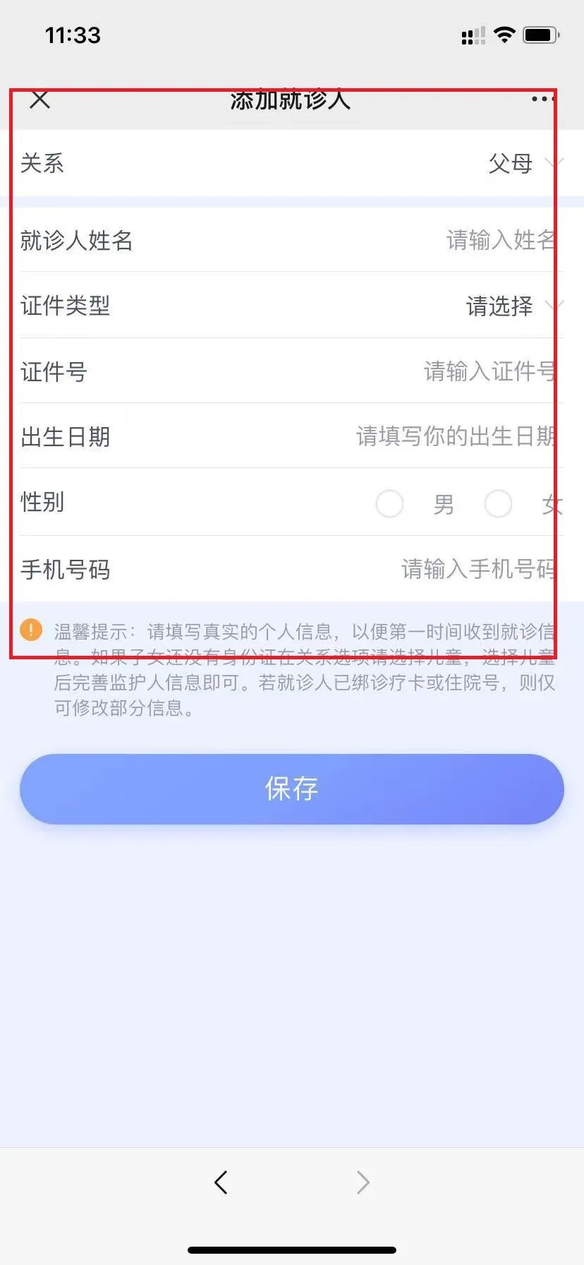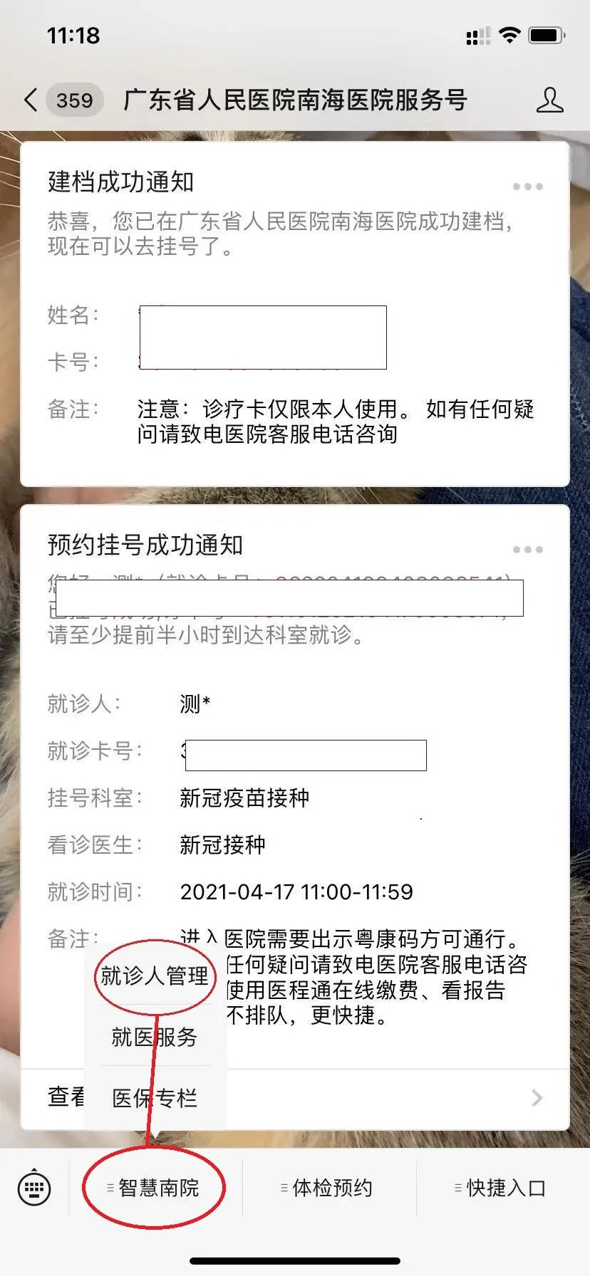 第二步、选择左下角的“智慧南院”-“就诊人管理”,选择“新增就诊人”,填写个人信息并保存。