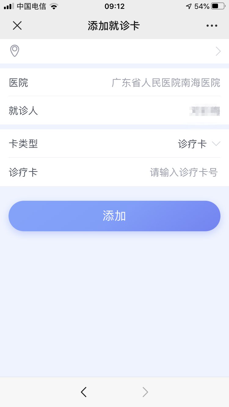 2、已办理我院诊疗卡的市民,点击“请输入诊疗卡号”-进行输入并点击添加。绑定成功后即可进行下一步挂号。