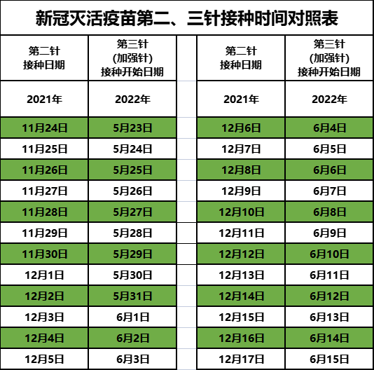 第一种:对照二针接种凭证时间,比如2021年12月15日前(含12月15日)完成第二针接种的,2022年6月13日就可以接种第三针了。