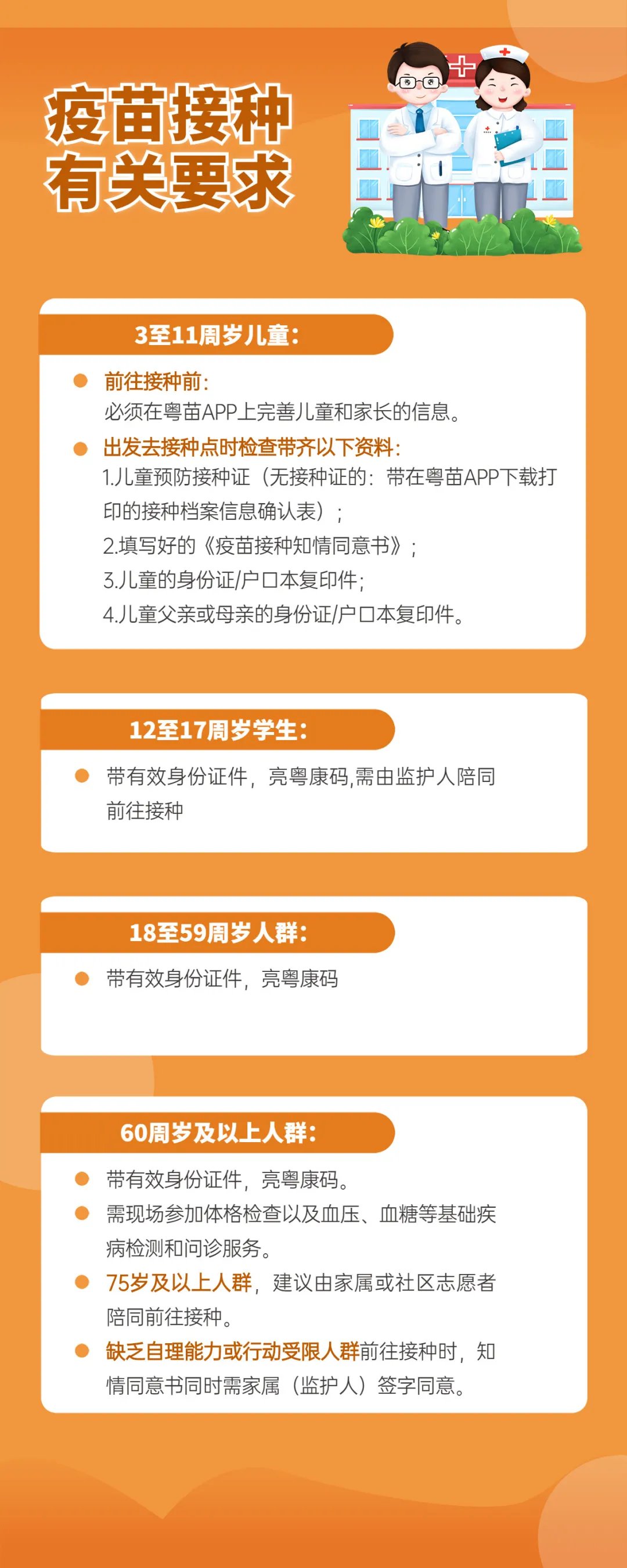 1、接种需携带有效身份证件(身份证、户口簿、居住证、驾驶证等)和粤康码(现场手机出示或提前彩色打印)前往接种点接种,第二针接种还需携带接种凭证(若粤康码未显示首针接种信息,需携带第一针接种凭证),65岁及以上长者还需携带社区卫生服务中心2021年的体检报告。现场自觉佩戴口罩、配合测量体温。