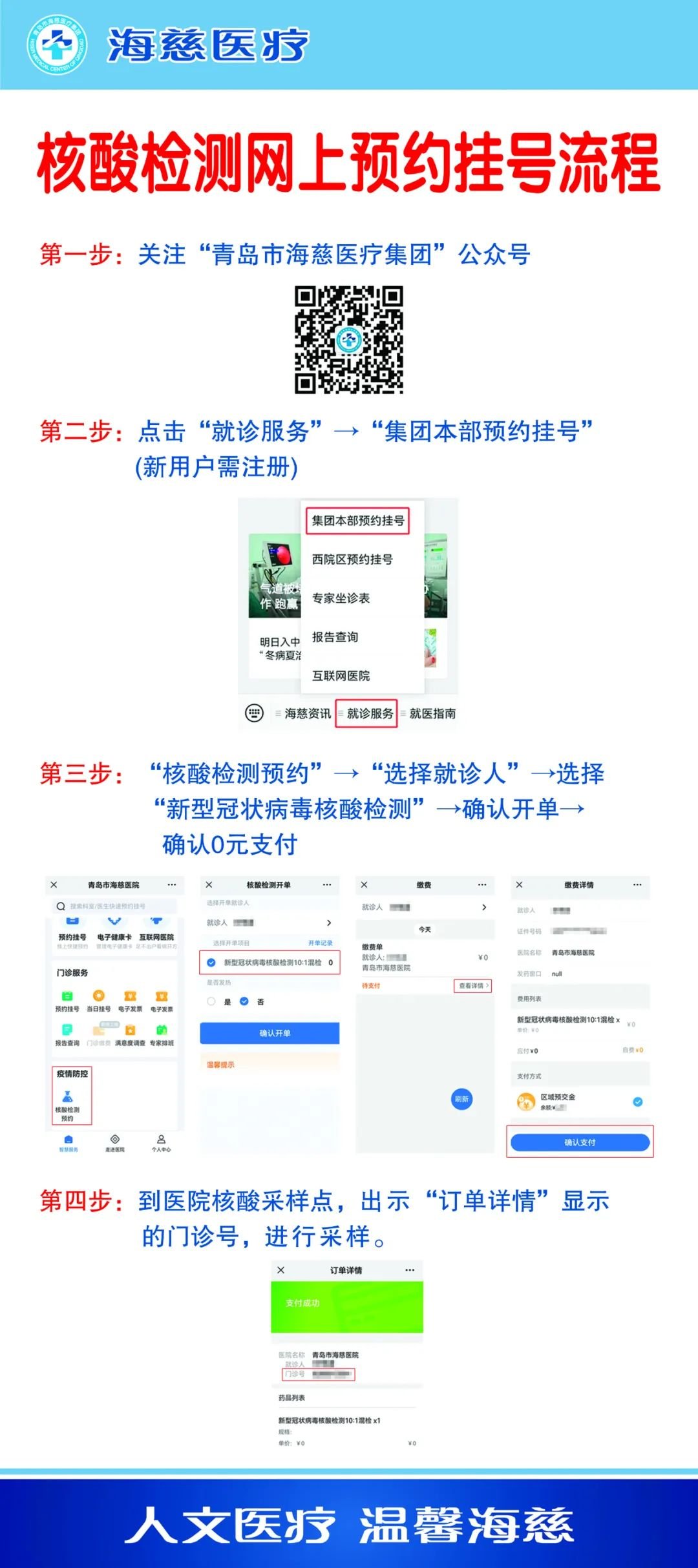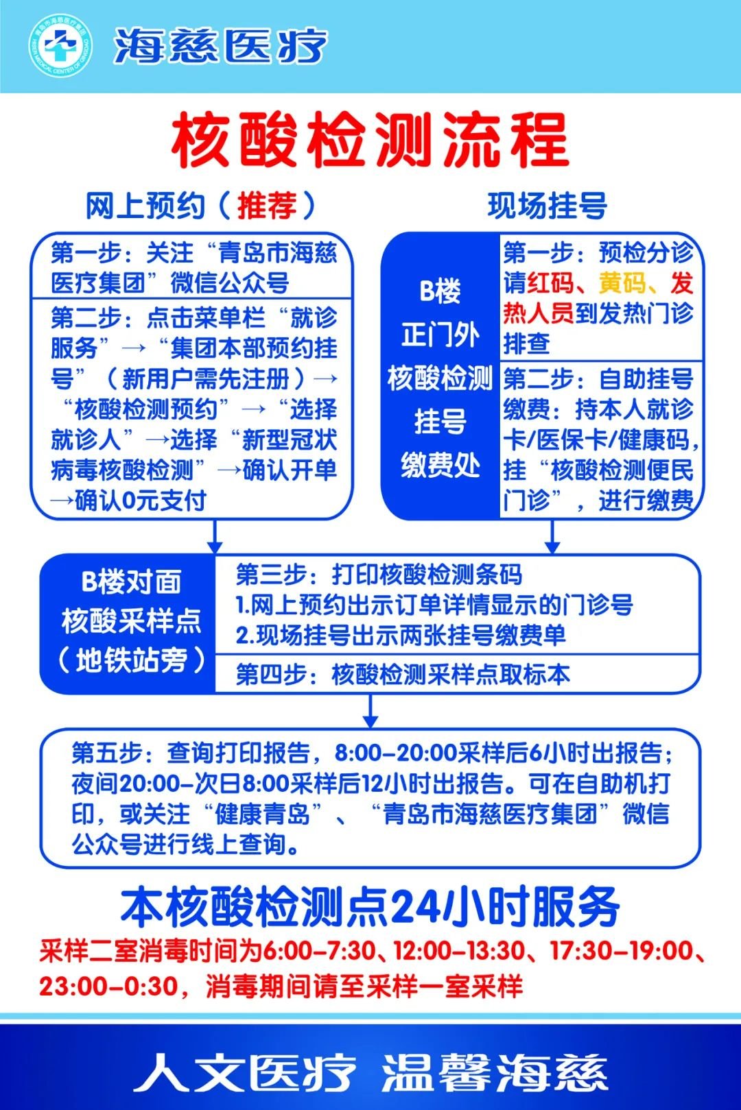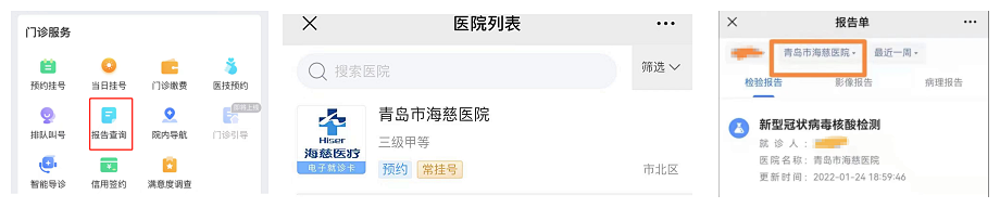 青岛市海慈医疗集团提供24小时核酸检测服务,并可通过关注“健康青岛”或“青岛市海慈医疗集团”微信公众号,在线查询检验报告,也可自行下载并打印,为市民提供更安全、更快捷的服务。