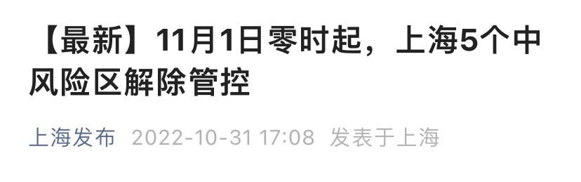上海市新冠肺炎疫情防控工作领导小组办公室发布消息:根据《新型冠状病毒肺炎防控方案(第九版)》要求,经研究决定,自2022年11月1日零时起,将以下5个中风险区解除管控: