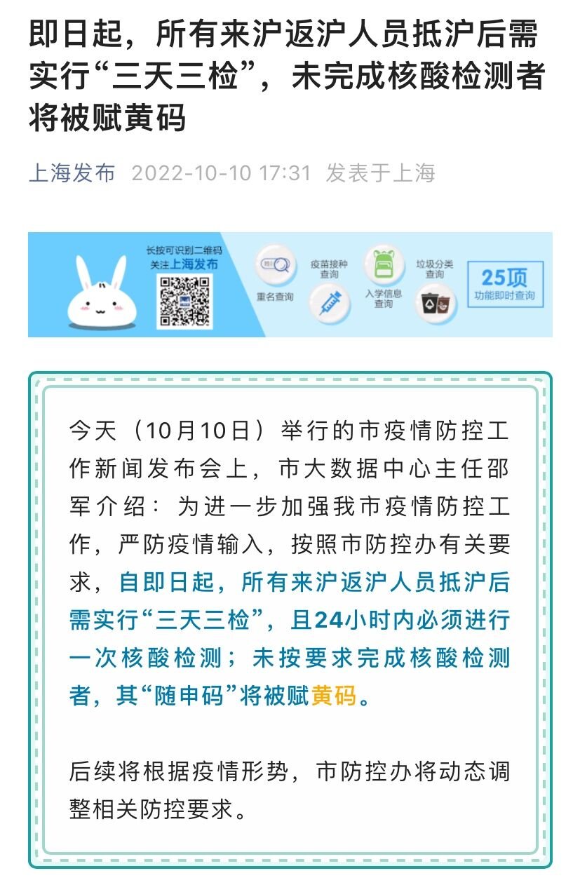 为进一步加强上海市疫情防控工作,严防疫情输入,按照市防控办有关要求,自即日起,所有来沪返沪人员抵沪后需实行“三天三检”(即3天内完成3次核酸检测),且24小时内必须进行一次核酸检测;未按要求完成核酸检测者,其“随申码”将被赋黄码。