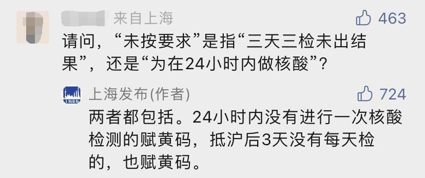 24小时内没有进行一次核酸检测的赋黄码,抵沪后3天没有每天检的,也赋黄码。请所有来沪返沪人员,按要求进行核酸检测。