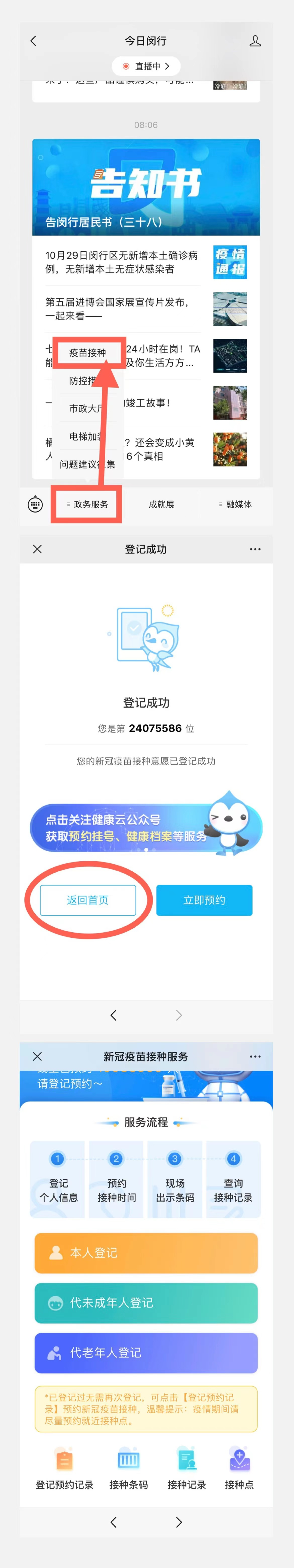 通过“健康云”或“随申办”的APP或微信小程序,“上海发布”“上海疾控”“今日闵行”微信公众号等途径进入“新冠疫苗接种服务”专区(建议使用手机号进行注册)。
