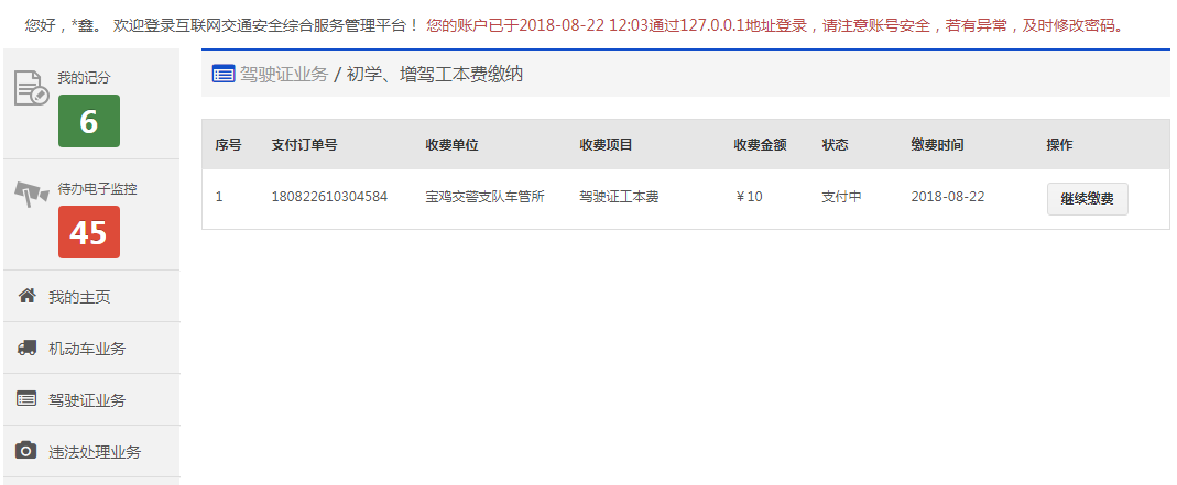 在该步骤会显示正在缴纳中的驾驶证工本费记录,点击对应记录后的【继续缴费】按钮,进入步骤2【确认缴费】。