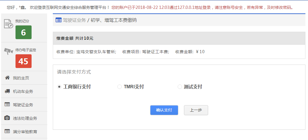 在该步骤,需确认收费单位、收费项目以及收费金额,选择完支付方式后,点击【确认支付】,进人第三方银行支付界面进行支付, 支付完成后请耐心等待, 于两小时后可在本平台查看驾驶证工本费支付结果。