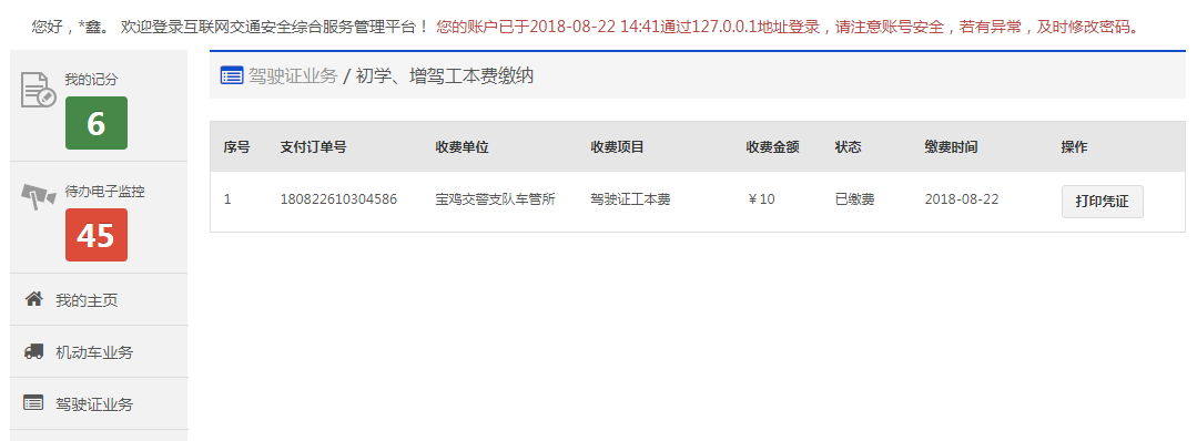 当缴费成功后,列表会显示缴费成功的驾驶证工本费记录,点击列表后的【打印凭证】按钮,可以打印驾驶证工本费缴费凭证。