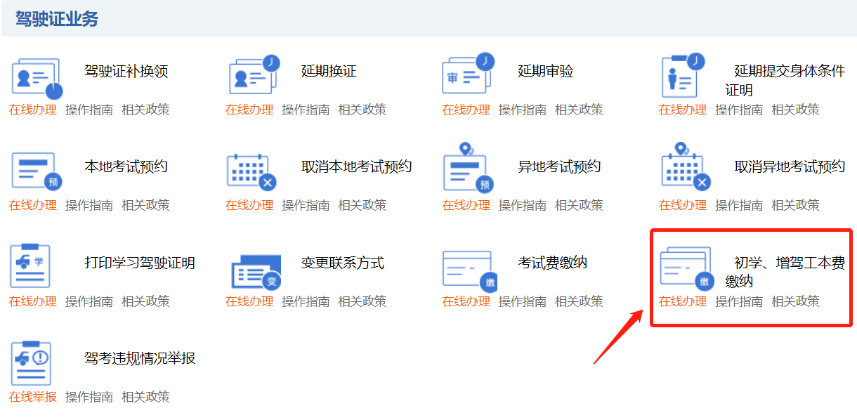 进入交管12123官方网站,在顶部菜单栏找到“业务办理”,点击并进入,在“驾驶证业务”栏中找到“初学、增驾工本费缴纳”,点击并进入。