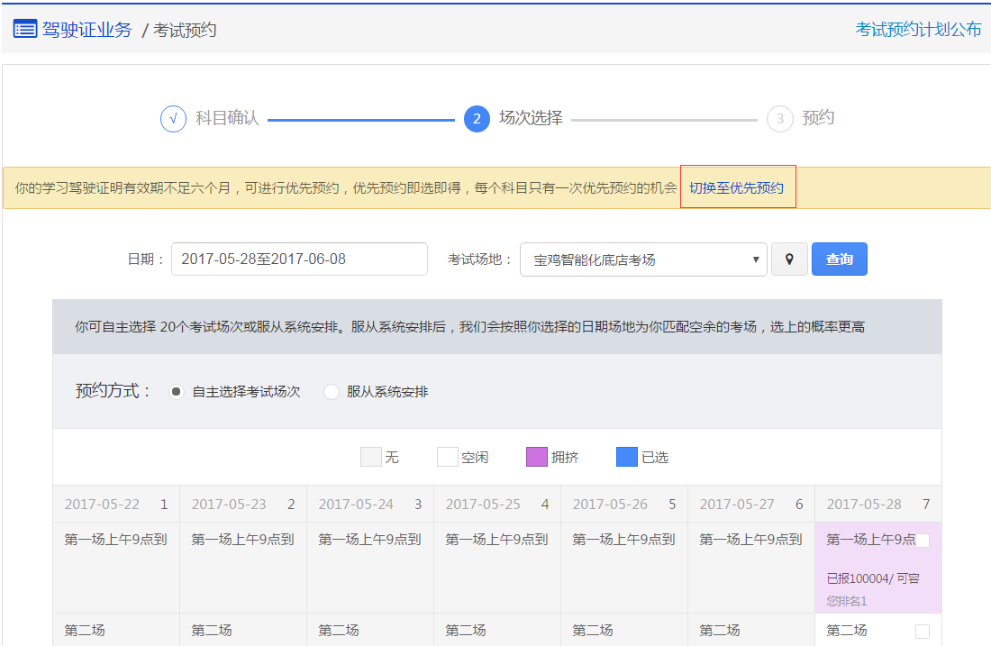 学员优先预约时,可以选择具有空余优先预约名额的考试场次进行预约。只要预约申请成功且学员不存在其他法规规定的不符合考试预约情形,就安排考试。