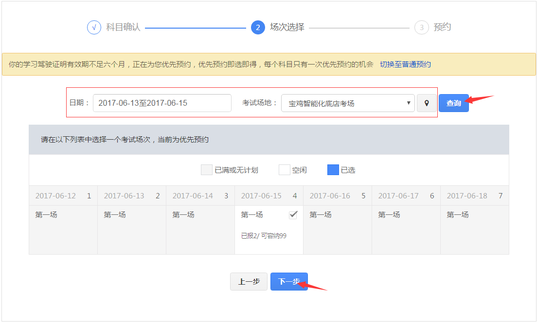 在该步骤,用户需选择考试日期和考试地点,点击【查询】,会显示对应的可预约的考试场次。